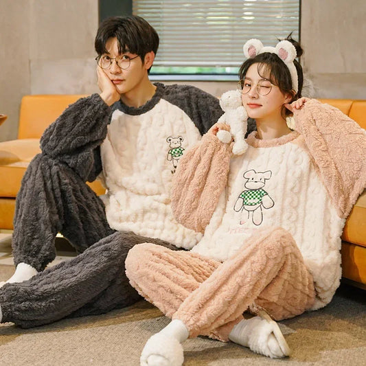 Thickened Coral Fleece Flannel Pajamas Set for Men And Women Home Clothes Comfortable Long Sleeve Sleepwear Winter Autumn