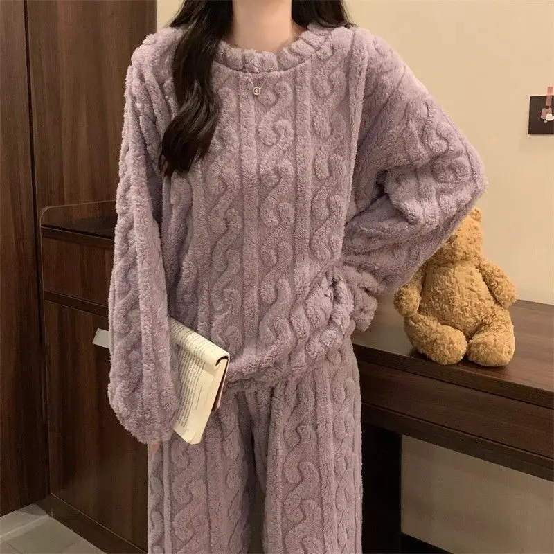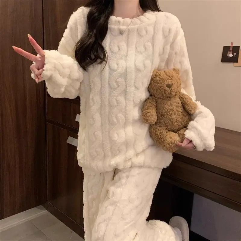 Autumn Winter Sweet Coral Fleece Pajamas Women Fleece-lined Thickened 2025 New Zip-up Flannel Warm Home Wear Set