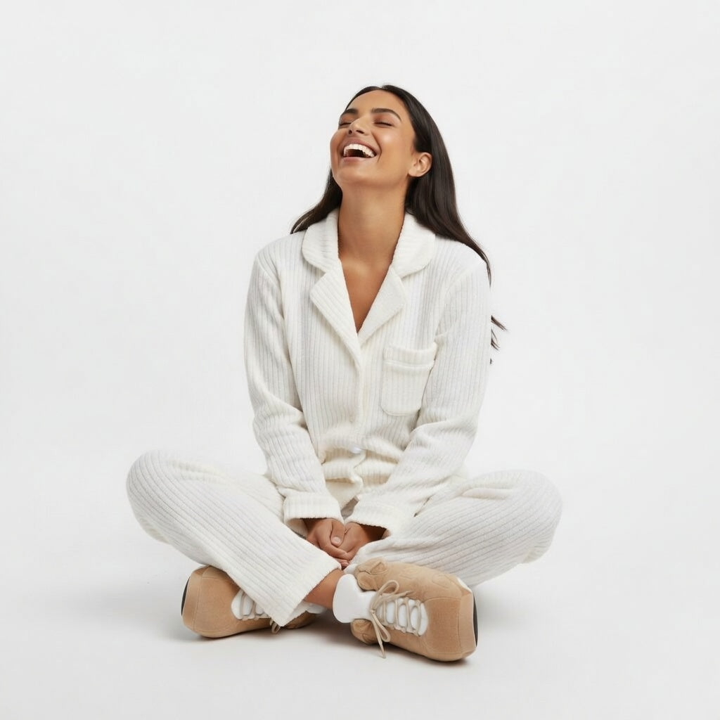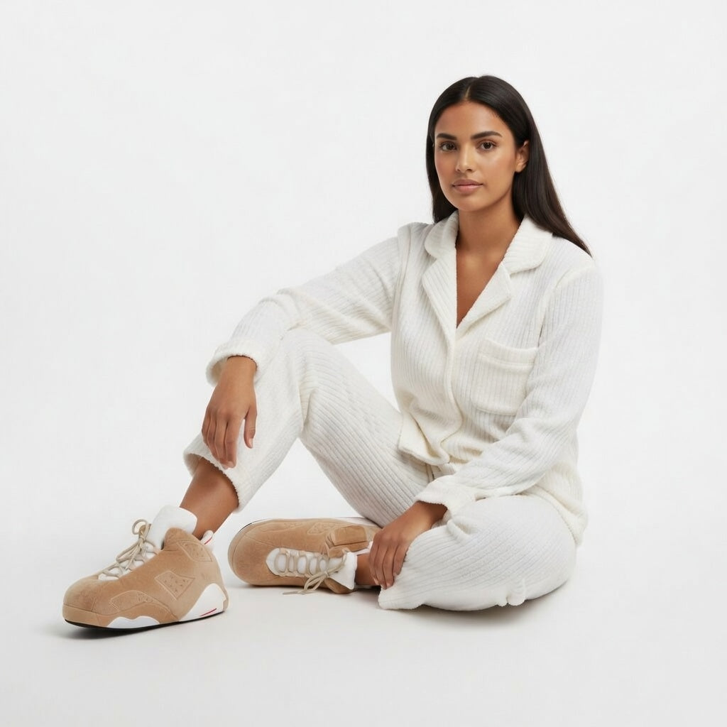 Dès que tu y glisses tes pieds, la texture vaporeuse d'un blanc immaculé t'accueille dans un cocon de chaleur et de légèreté absolue. Le contact avec la doublure ambrée est une caresse subtile, rappelant la douceur du soleil couchant sur la pierre chaude d'un village médiéval. C'est une étreinte moelleuse et aérienne qui transforme chaque pas en une déambulation sereine dans ton propre jardin d'Éden.
