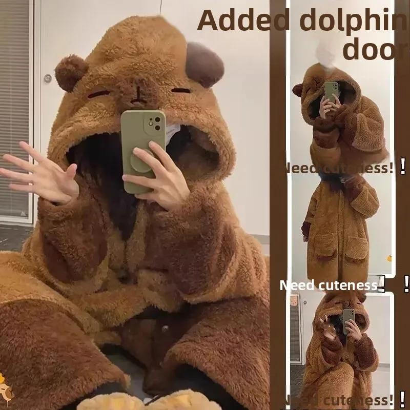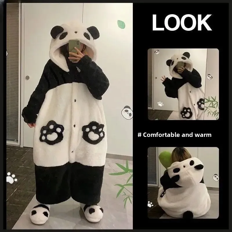 Cute Plush Bear Robe Women's Autumn Winter Coral Fleece Thickened One-Piece Sleepwear Home Clothes Robe Comfortable Homewear
