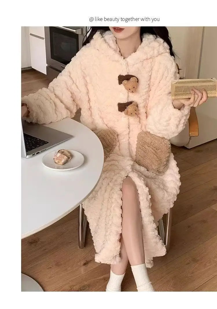 Korean Style Long Hooded Coral Fleece Sleepwear Women's Thickened Autumn Winter New Arrival Comfortable Home Leisure Robe
