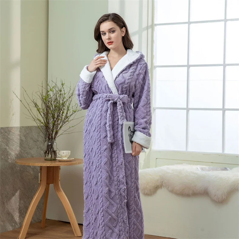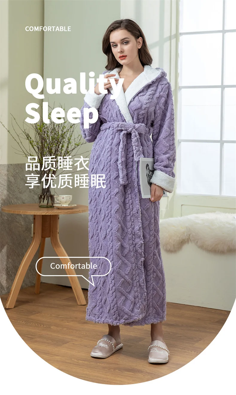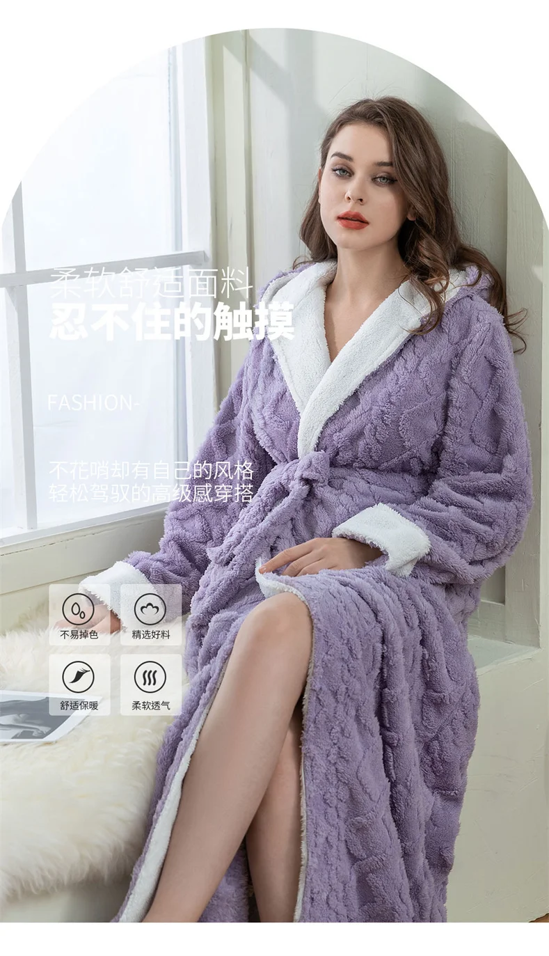 Thick Women Warm Bathrobe Solid Hooded Warm Ladies Dressing Gown Long Sleeve Flannel Bath Robe For Female