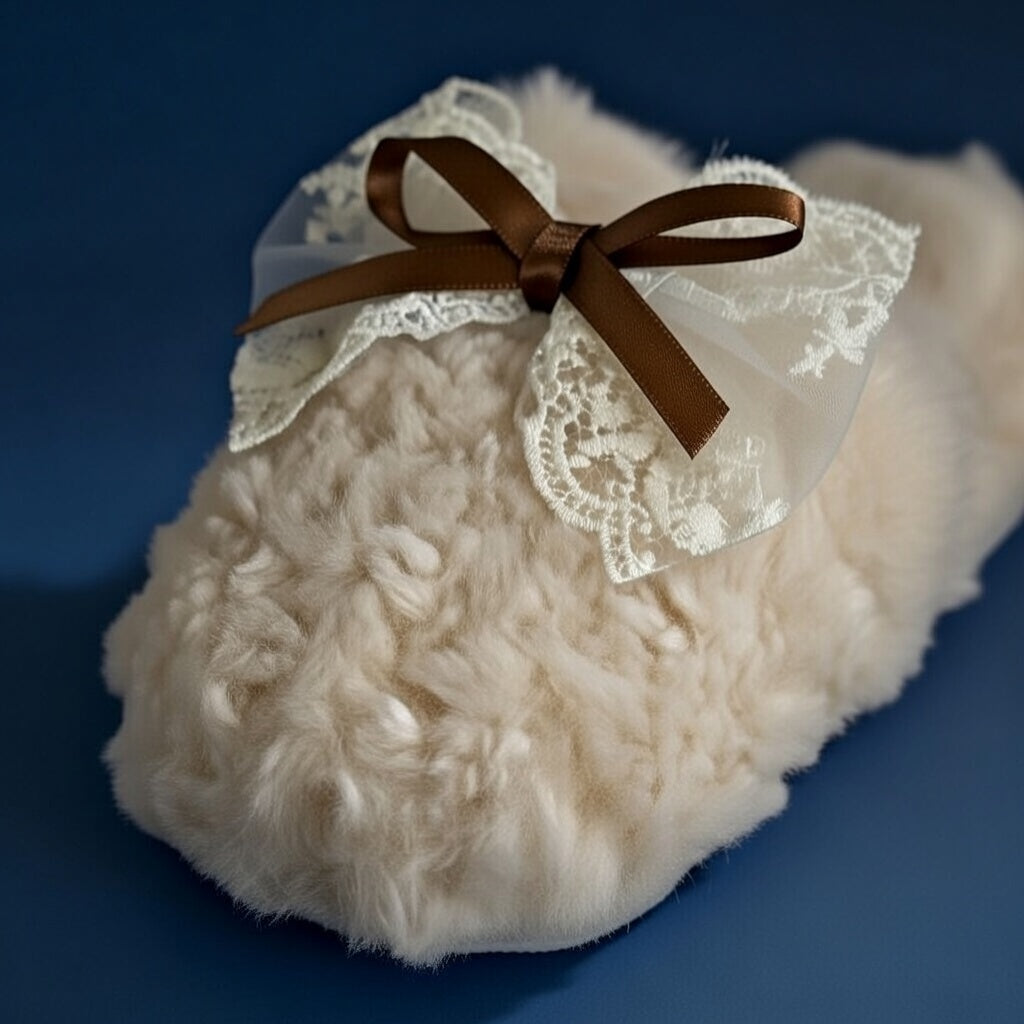 Dès que tes pieds rencontrent cette douceur vaporeuse, l'agitation du monde s'efface instantanément. C'est un retour à l'essentiel, une caresse délicate qui célèbre ta féminité naturelle dans le calme de ton foyer. Tu glisses tes pieds dans un cocon où la texture bouclée rencontre le raffinement de la dentelle pour une sensation de bien-être immédiat.